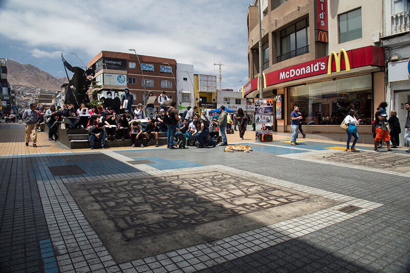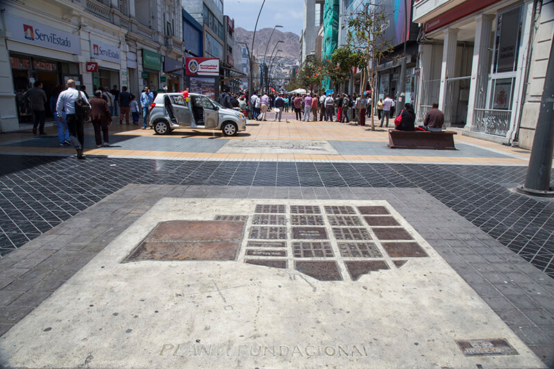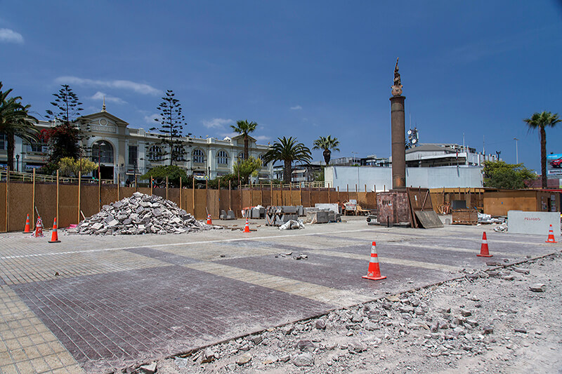 Ubicada en el centro de Antofagasta. Cambio de 1500 metros cuadrados de baldosas y construcción de in drenaje de aguas lluvias bajo la plaza.
